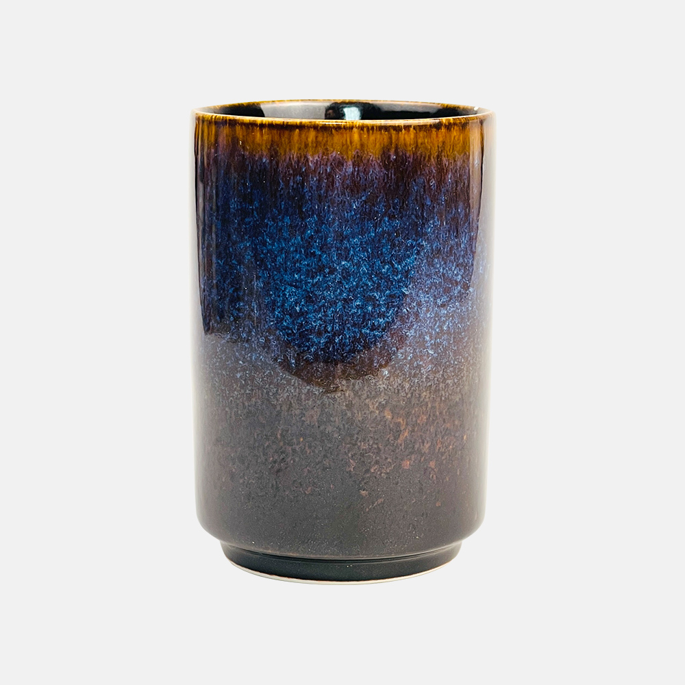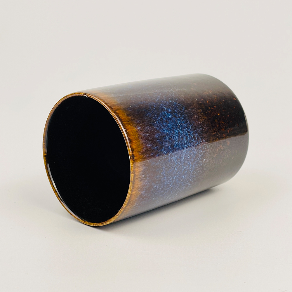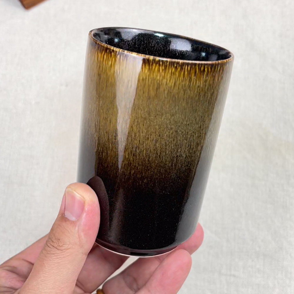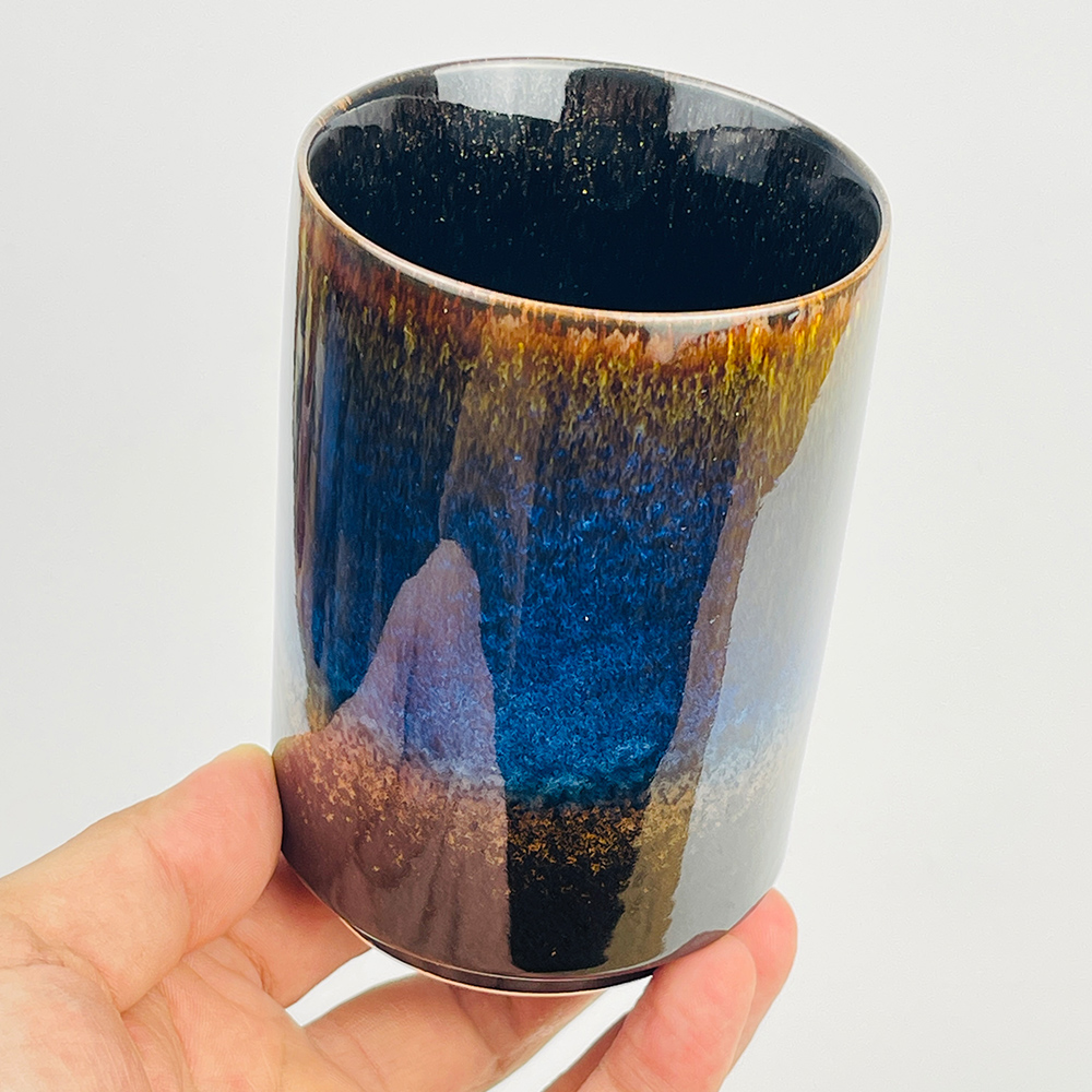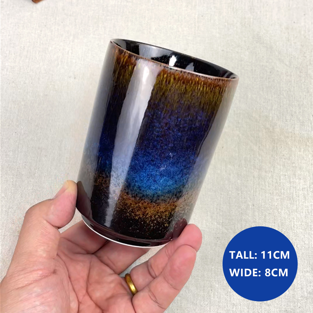 2.This is a newly made ceramic cup with kiln transformed glaze, featuring a straight tube shape and a blue black gradient with star shaped crystalline texture (similar to starry sky/ink blending). The rim of the cup is embellished with brown gold glaze, giving it a vintage style that combines art and texture. It is definitely worth collecting.