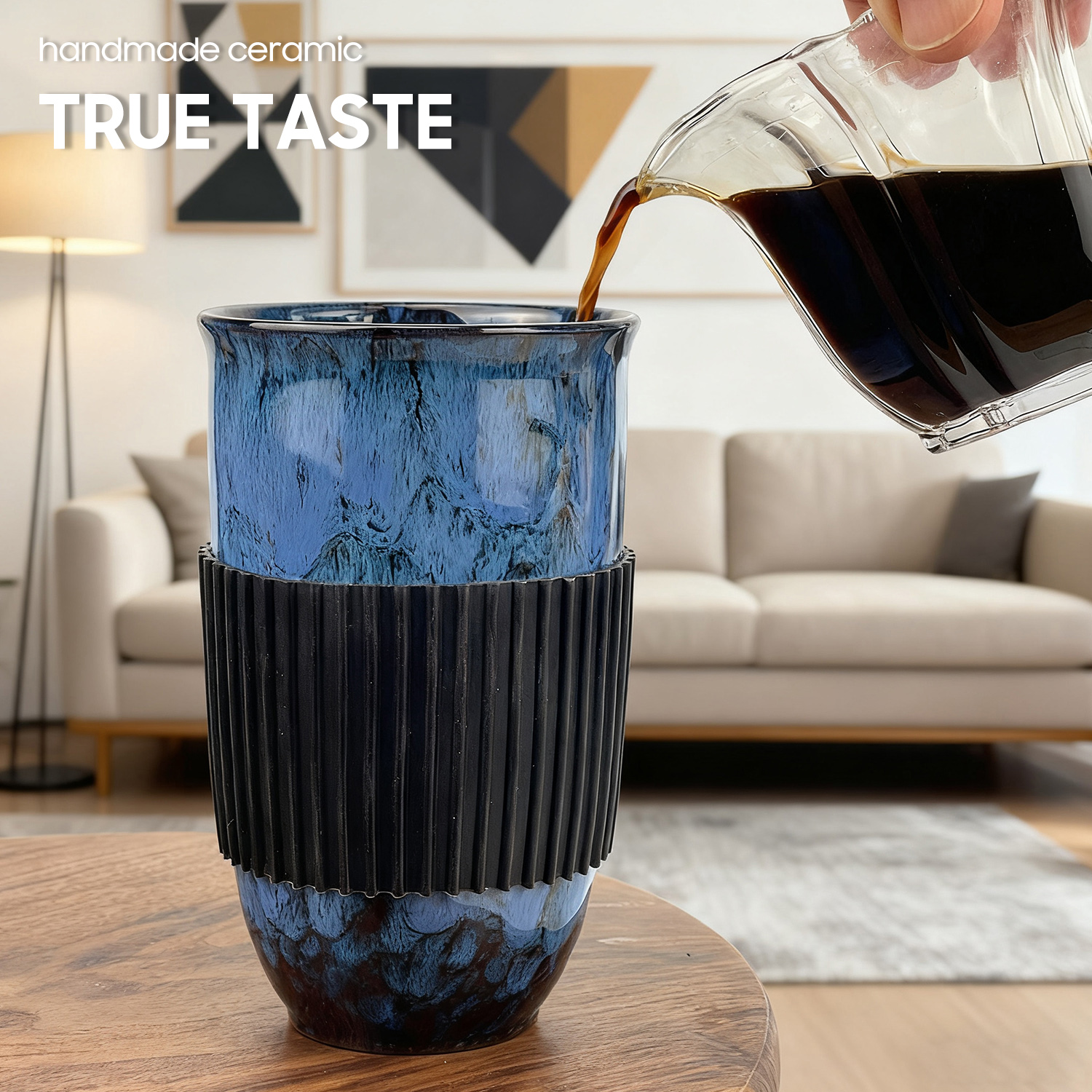 The cup adopts a unique kiln transformation process, with a deep blue purple glaze as the main color, and a texture of undulating mountains and misty clouds, presenting a natural and artistic mottled effect. Each glaze color change is a unique product of factors such as temperature and atmosphere inside the kiln.